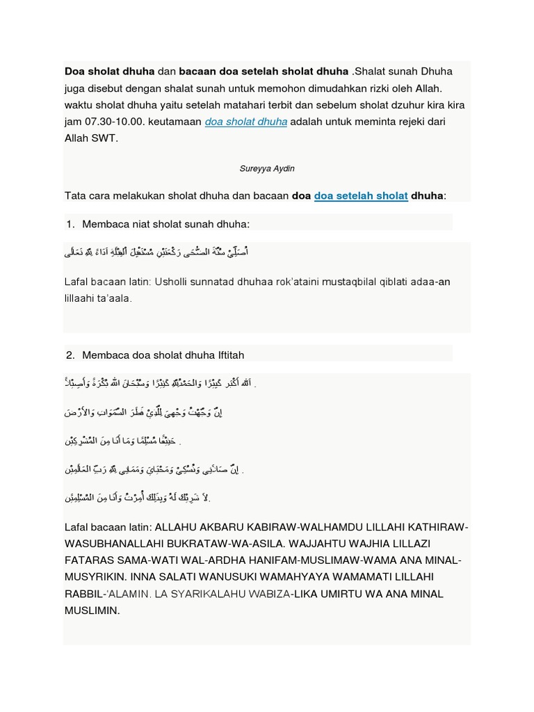 Doa sholat dhuha sholat dhuha merupakan salah satu sholat sunah yang memiliki banyak keutamaan salah satunya untuk melancarkan rezeki dalam kehidupan sehari hari. Sementara mengenai panduan tata cara waktu mengucapkan niat serta doa sholat dhuha tidak memiliki perbedaan dengan sholat pada umumnya baik itu yang di wajibkan 5 waktu atau sholat sunnah lain yaitu di mulai dengan niat ketika takhbirotul ikhram dan di akhiri dengan salam sambil menengok kanan dan kiri setelah itu di lanjut dengan membacakan dzikir atau berdoa dan bacaan bacaan lainnya. Jika teman teman belum hafal doanya silakan pelajari baca berulang ulang maka dengan sendirinya lama kelamaan akan hafal.